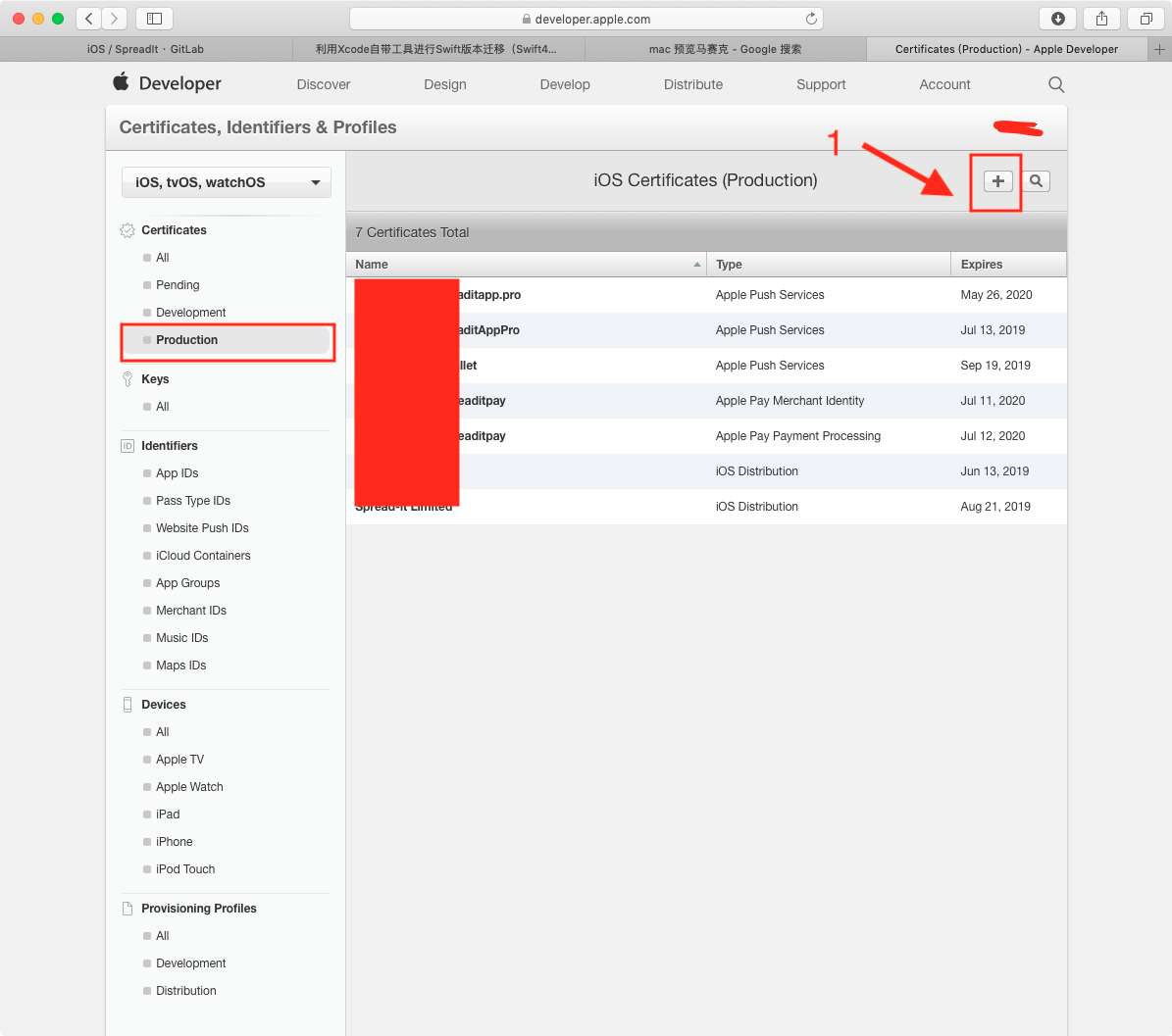2.1 点击 Certificates 中的 Production可以看到所有的生产环境的证书,同时也可以看到是否过期。选择右上角的新建+,如下图所示。