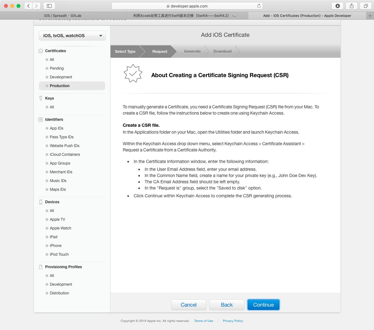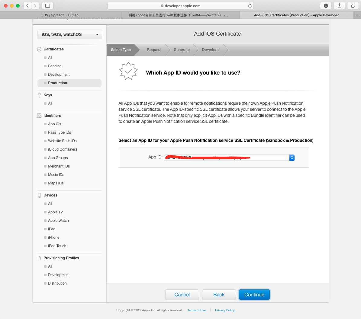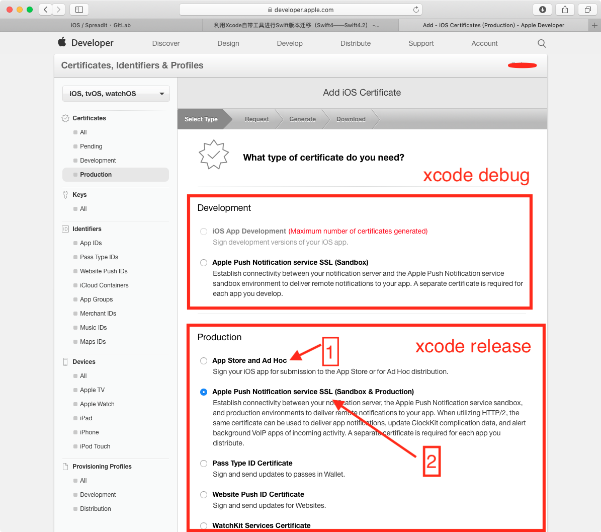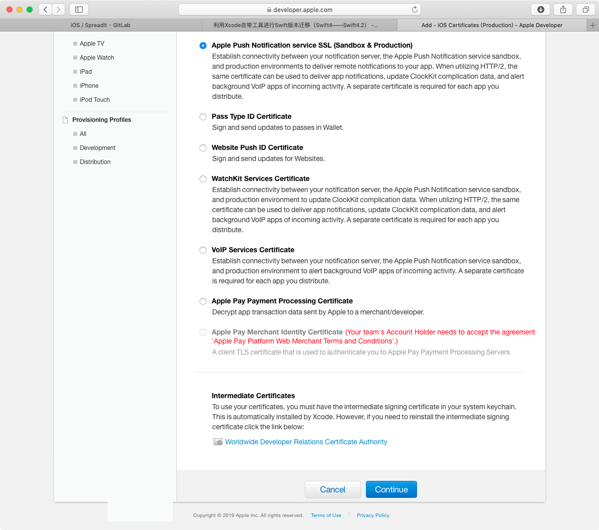 选择证书的适用的场景, (1)Development 对应 xcode 中的debug环境,开发调试的使用,包含了推送与非推送版本。 (2)Production 对应 xcode 中的 release 环境,也即是上线 app store 的环境, 常用的是有不带推送的、带推送的、带apple pay的证书。 示例就以生产中带推送的做参考,选择 Apple Push Notification, 点击Continue。