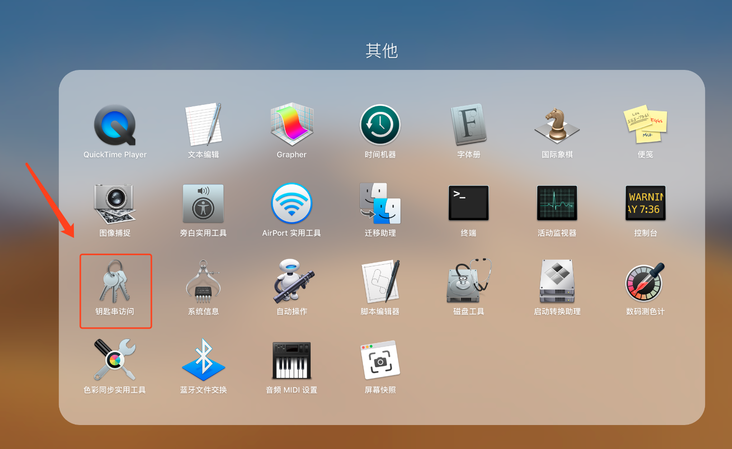 在mac应用程序中找到 “钥匙串访问”,打开“钥匙串访问”app,