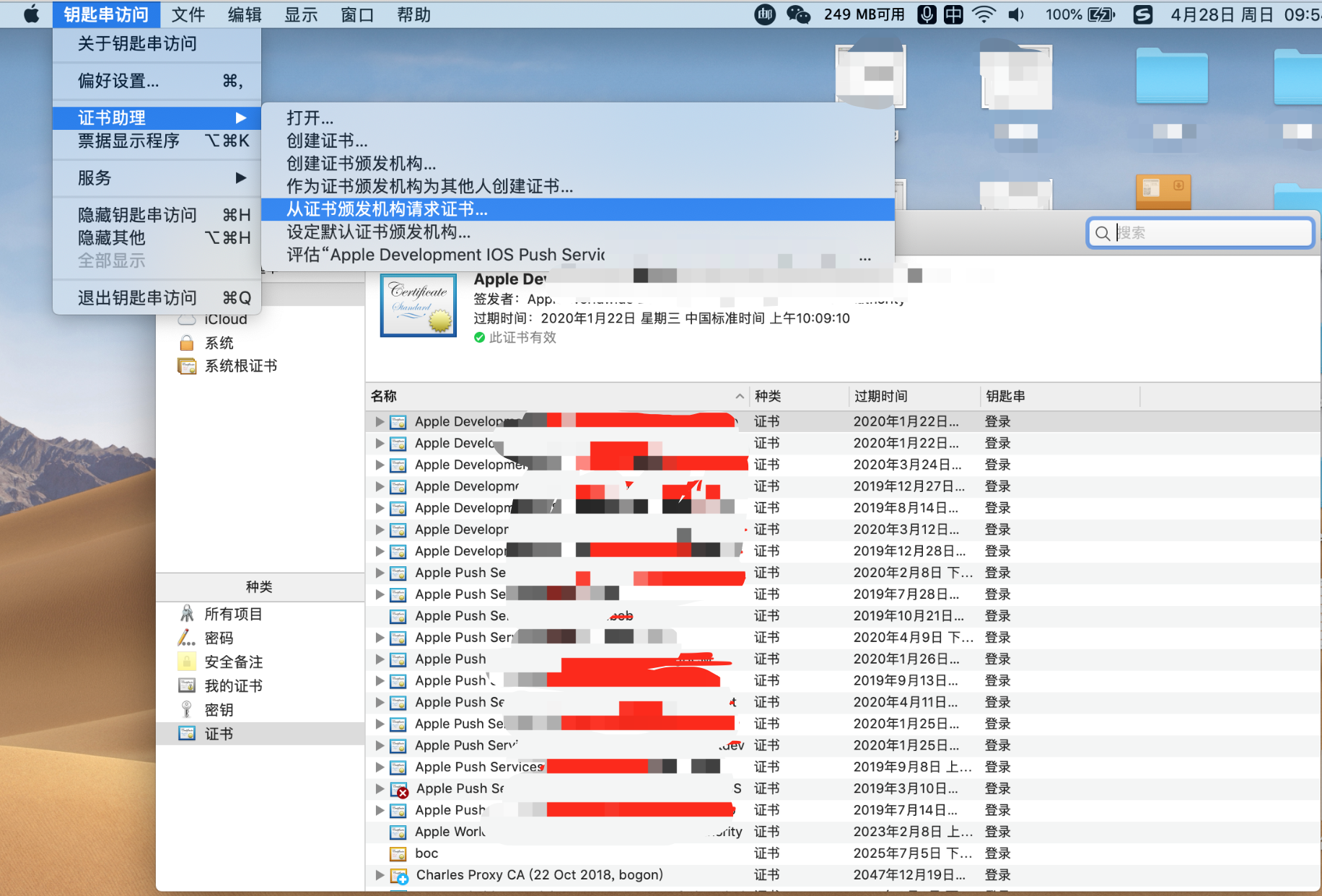 在导航栏中点击“钥匙串访问”-> "证书助理" -> "从证书颁发机构请求证书",