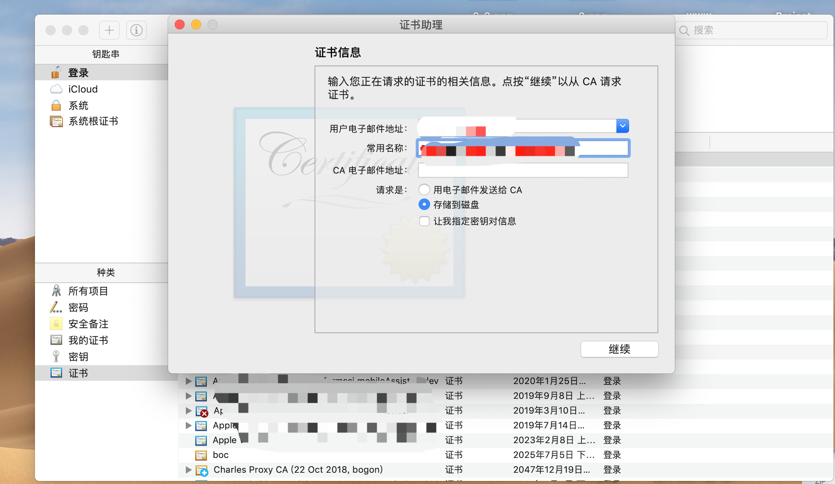 输入邮箱地址,常用名称,选择存储到磁盘,点击“继续”.其中常用名称可以采用公司名称+app名称+环境名