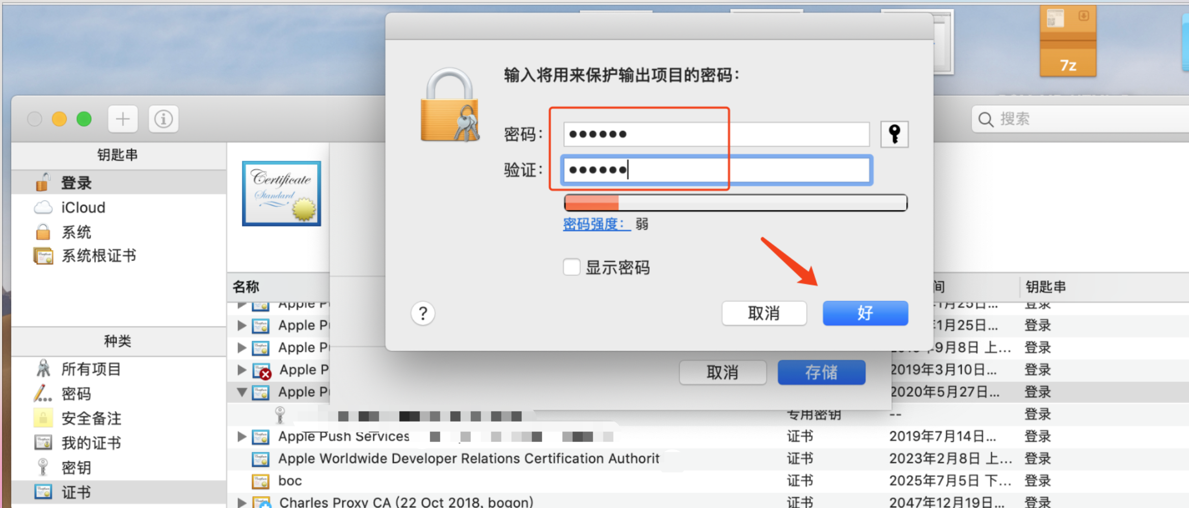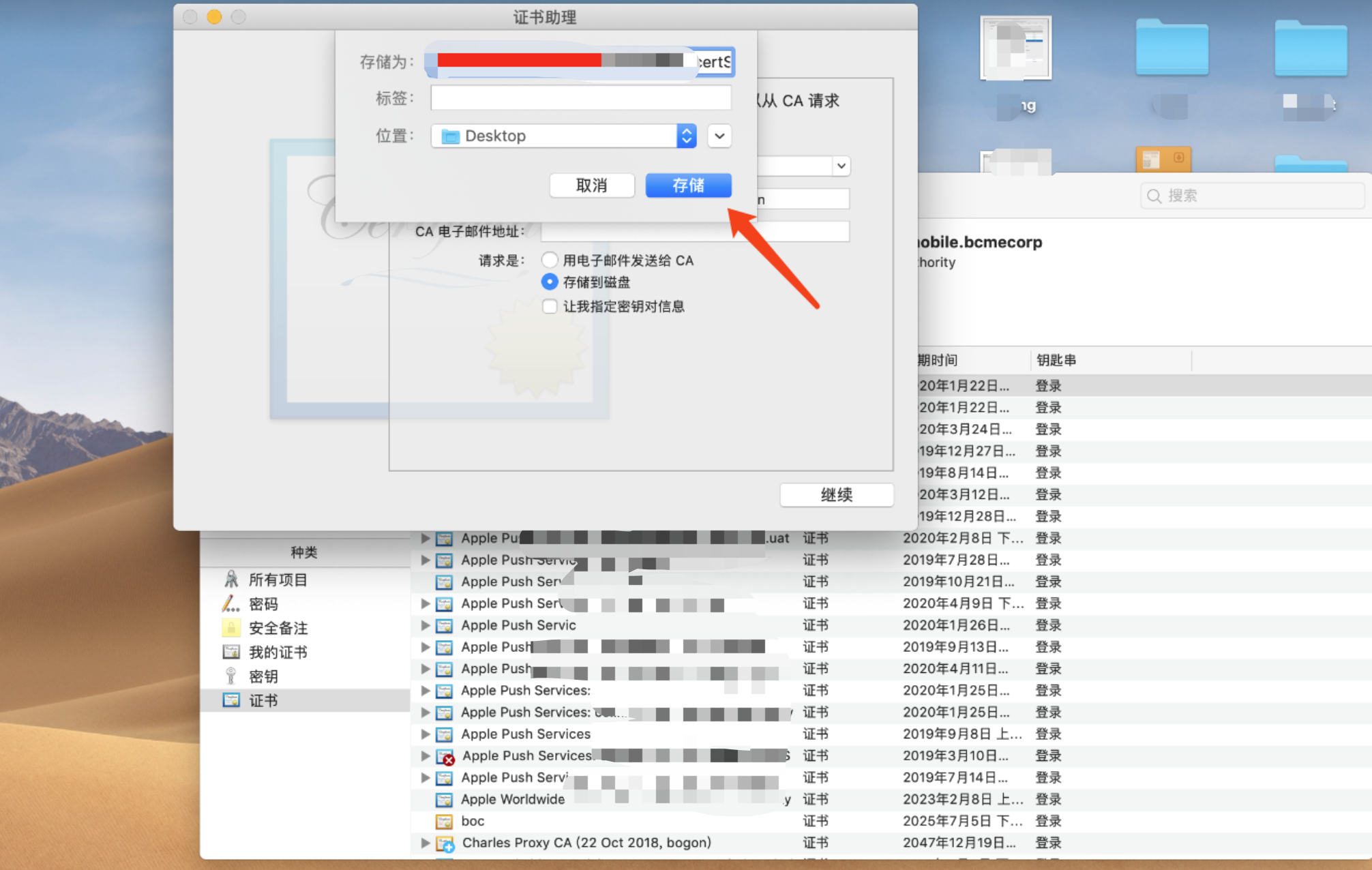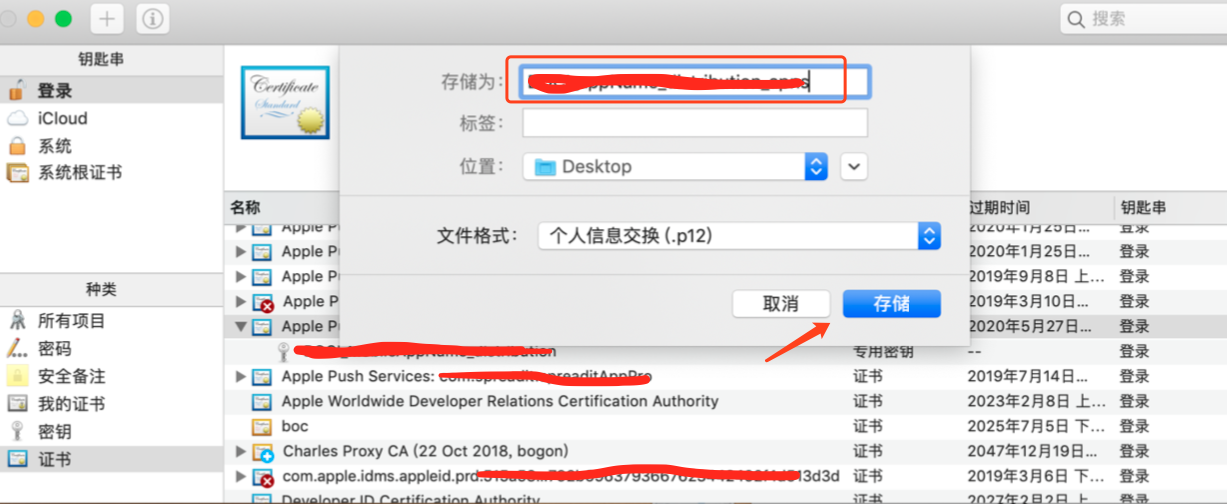 弹出保存框, 输入存储名称,选择存储位置,点击"存储"。存储名称建议使用公司名称+app名称+环境+apns的形式,方便以管理。
