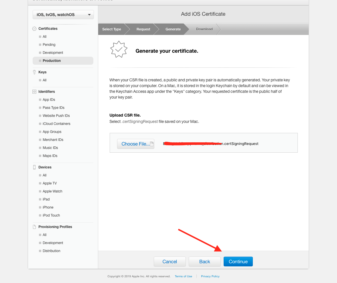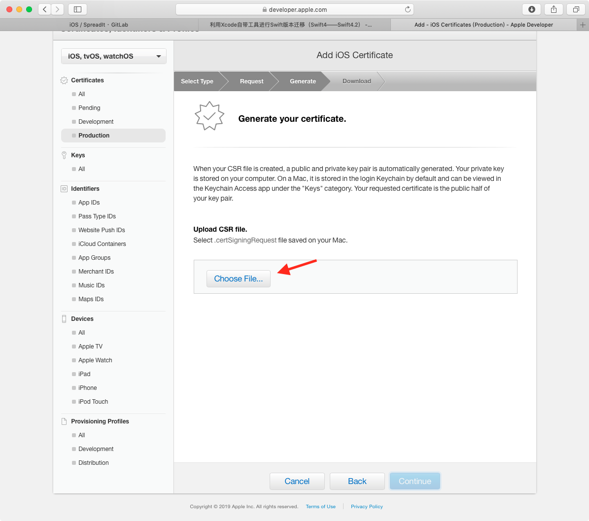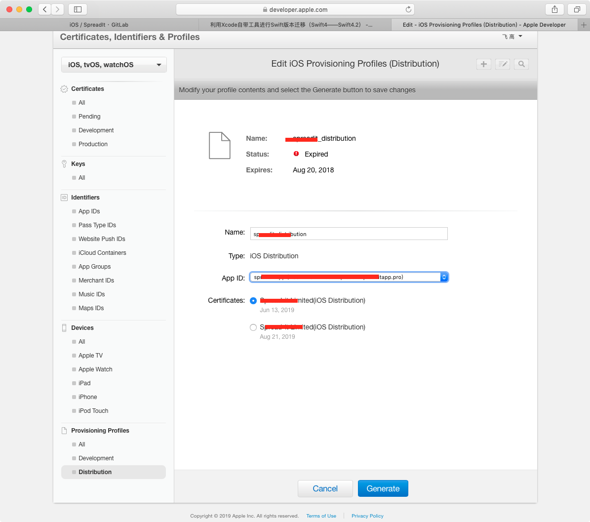 选择对应的App ID 以及 Certificates, 点击 “Generate”
