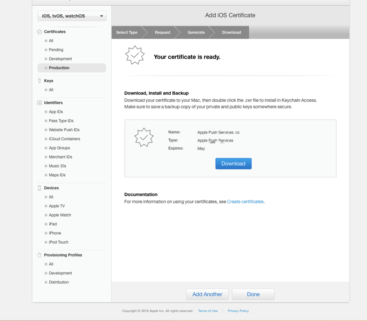 上传完成之后,证书就生成完毕, 点击"Download",下载到本地磁盘。