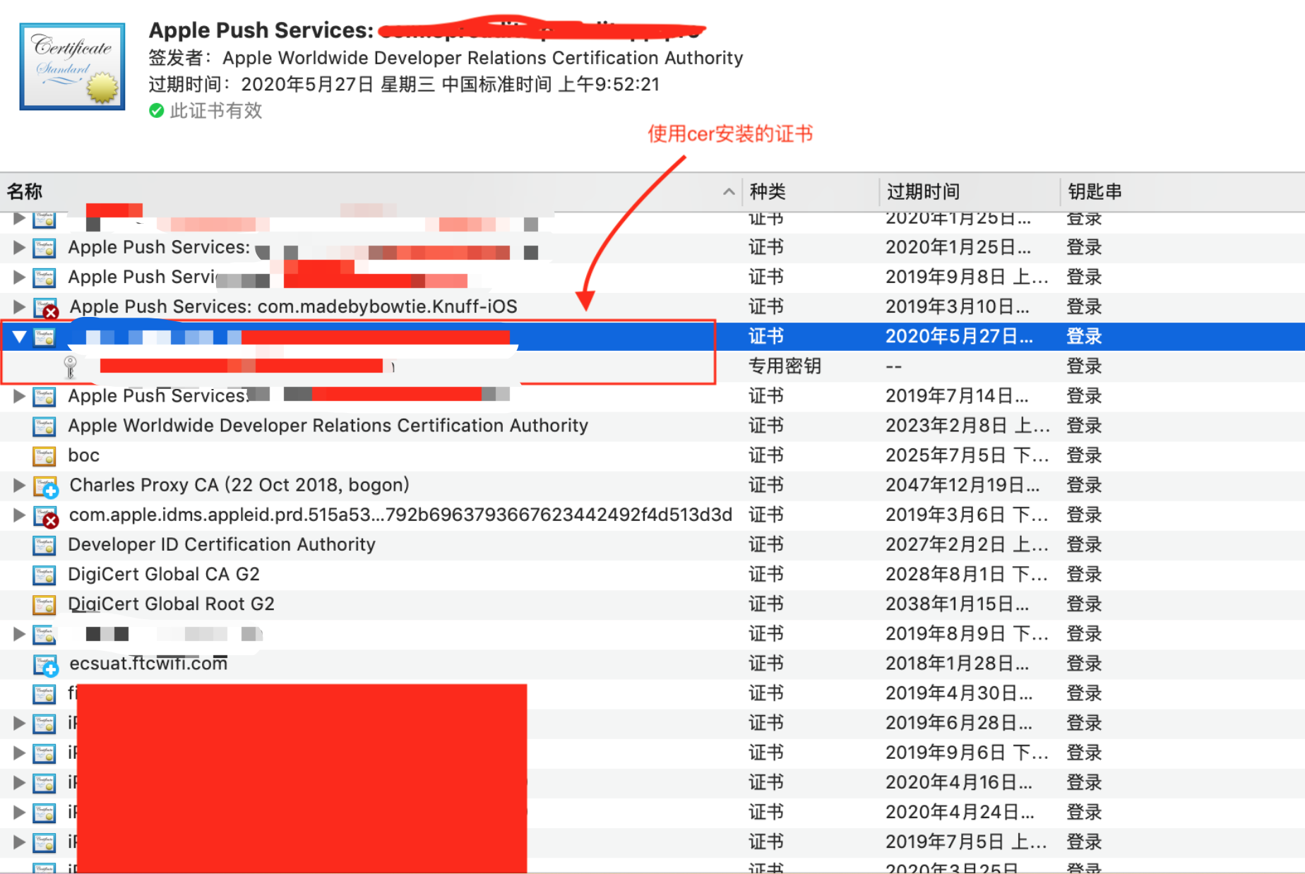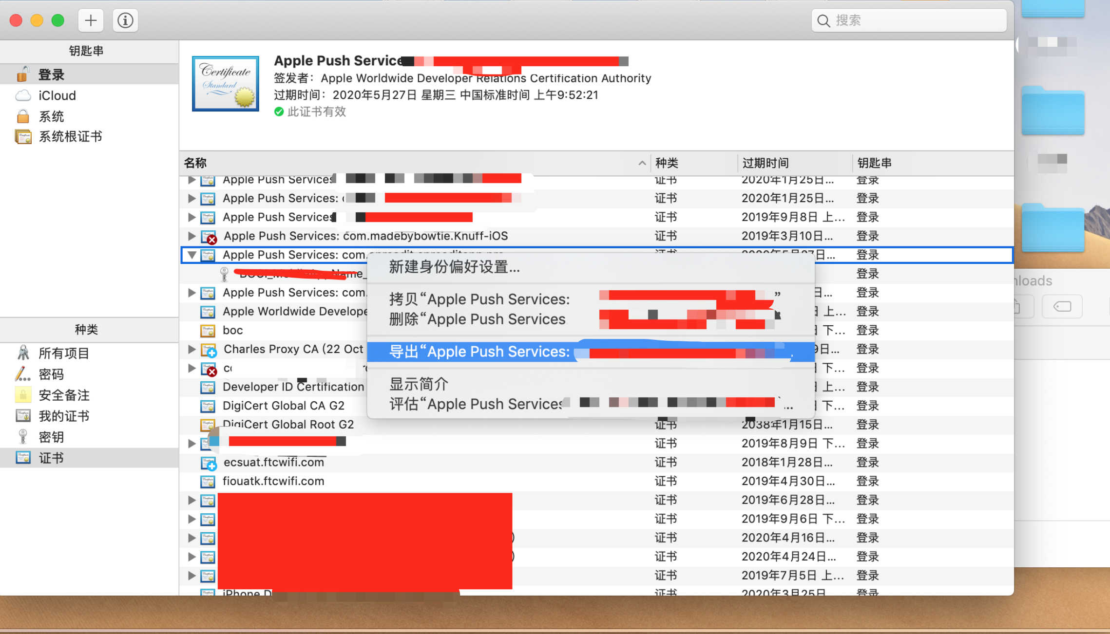 接下来说明一下导出P12文件给服务器使用。 在钥匙串中找到对应id的证书(可以通过id+证书名称确定)