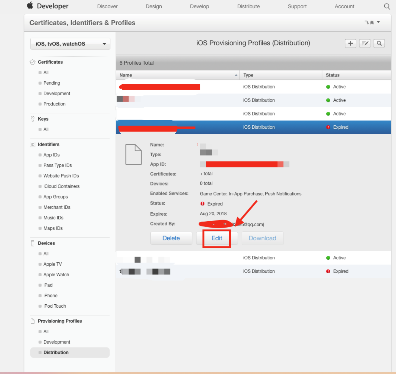 再次回到apple deleloper 页面,找到已过期的的描述文件(Provisioning Profiles),点击“Edit”,