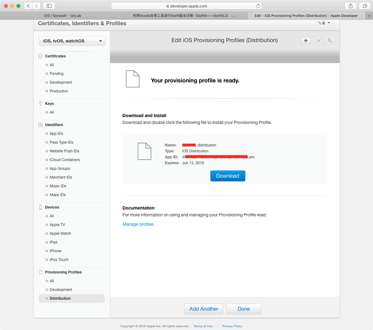 到此新的Provisioning Profiles 已生成,点击"Download"