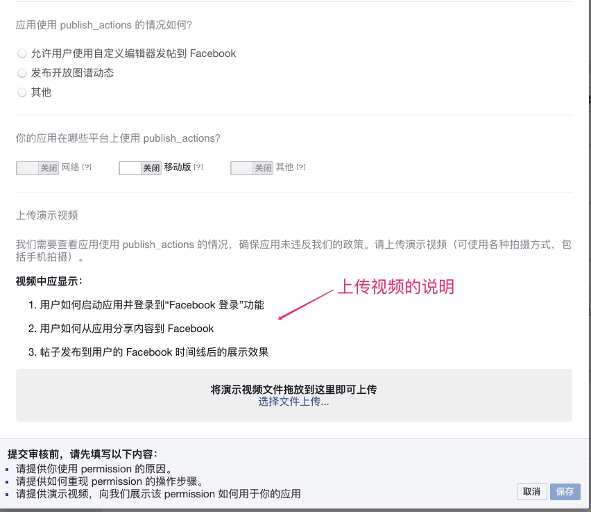 如果安装了原生 Facebook 应用,4.0-4.4 版的 SDK 会切换到原生 iOS 版 Facebook 应用,并在发布帖子后将控制权交还您的应用。如果使用 4.5+ 版 SDK,除非分享内容是开放图谱动态,否则用户会看到 iOS 分享表,而不会切换到原生 iOS 版 Facebook 应用。 说明: 目前下载的最新SDK版本为4.21.0,想要使用跳转到Facebook应用分享,需要申请public-action权限,才能使用图谱,否则只能使用web显示分享,目前还没申请下来该权限,只能做到web分享