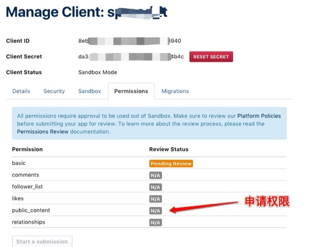 客服端申请权限,目前只申请下来basic权限,public_content权限没申请下来,没能继续测试是否能拿到用户发布的内容,但是理论上是可以的,且看下面的介绍)